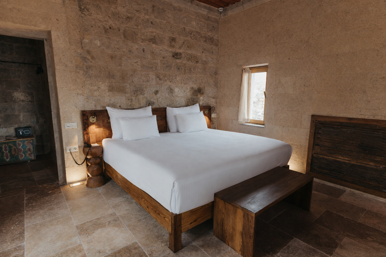 Otel odalarımızın eski mimari yapıya uygun olarak restore edildiğini, bu nedenle her odanın birbirinden farklı olduğunu hatırlatmak isteriz. Özel istekleriniz için lütfen otelle iletişime geçmekten çekinmeyin. Hem iş gezileri, hem de aile tatilleri için ideal olan bu geniş süitler, uyku ve yaşam alanlarıyla konaklamanız için ihtiyaç duyabileceğiniz tüm ekstra alanı sağlar. Balkonlu Suite (35 m2) küvet, klima ve vadi manzarası deneyimi sunar.